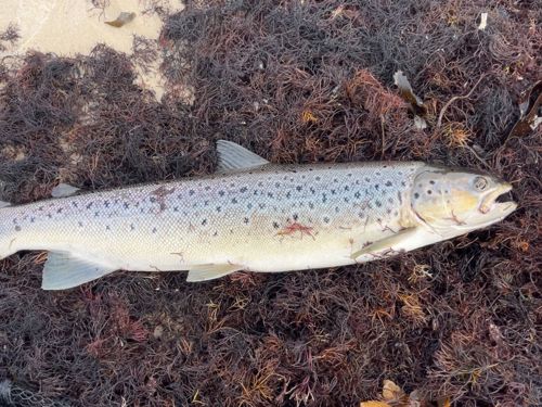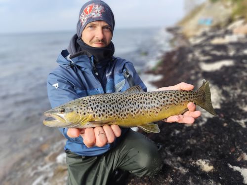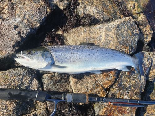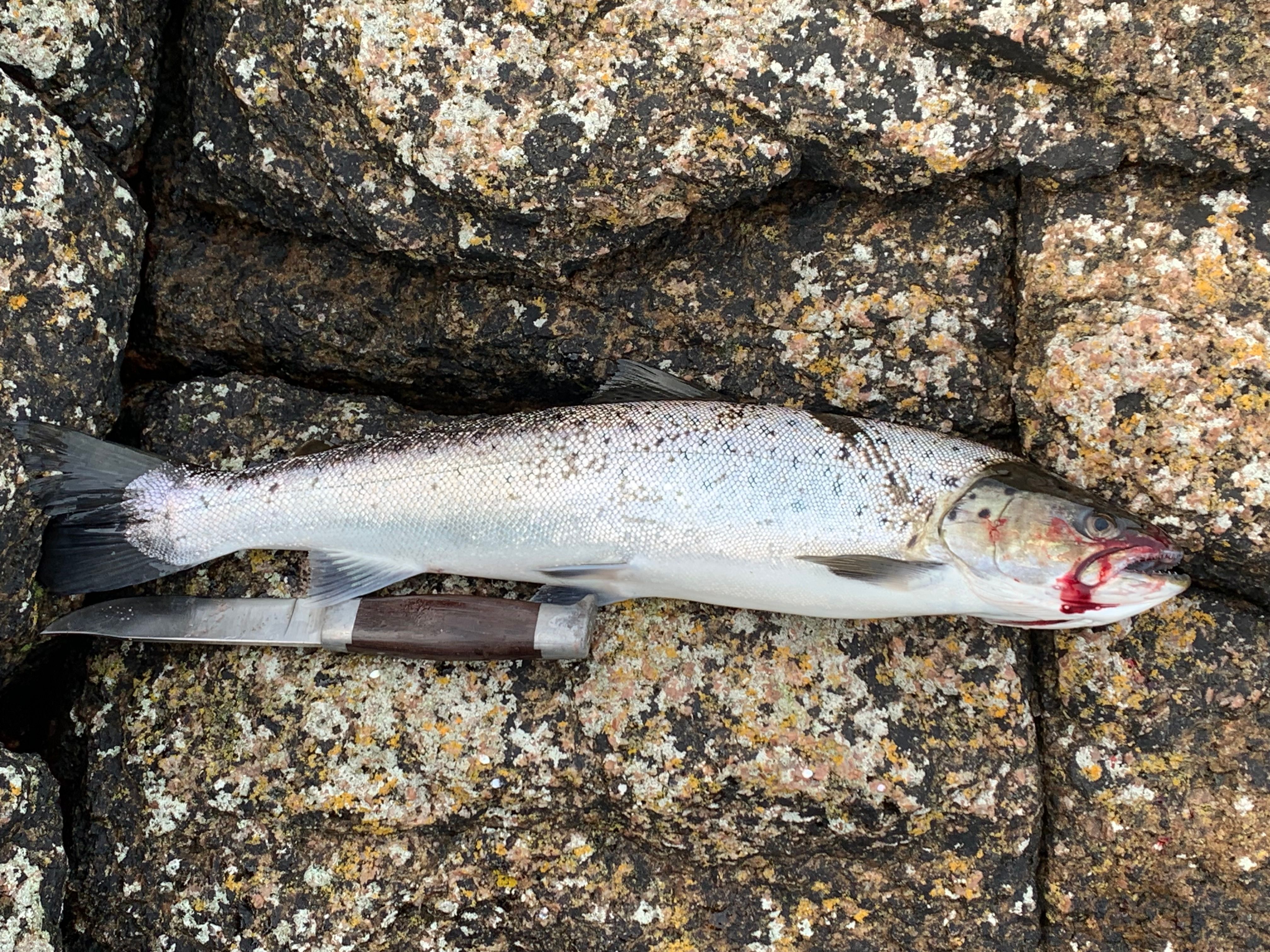 Sjov fisk at fange - bed på krogen "næsten på nedfaldet fra kastet - jeg må have ramt den i hovedet" - derefter var der fest - spring ud af vandet flere gange, flere udløb, ville "ind mellem klipperne" .... - men fik den til sidst.