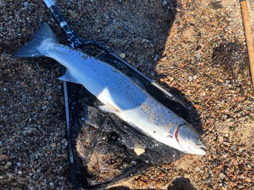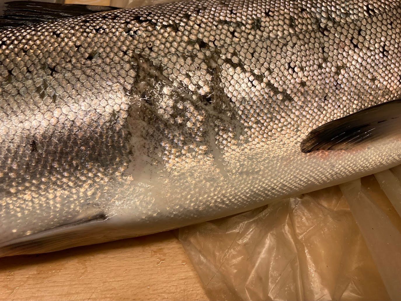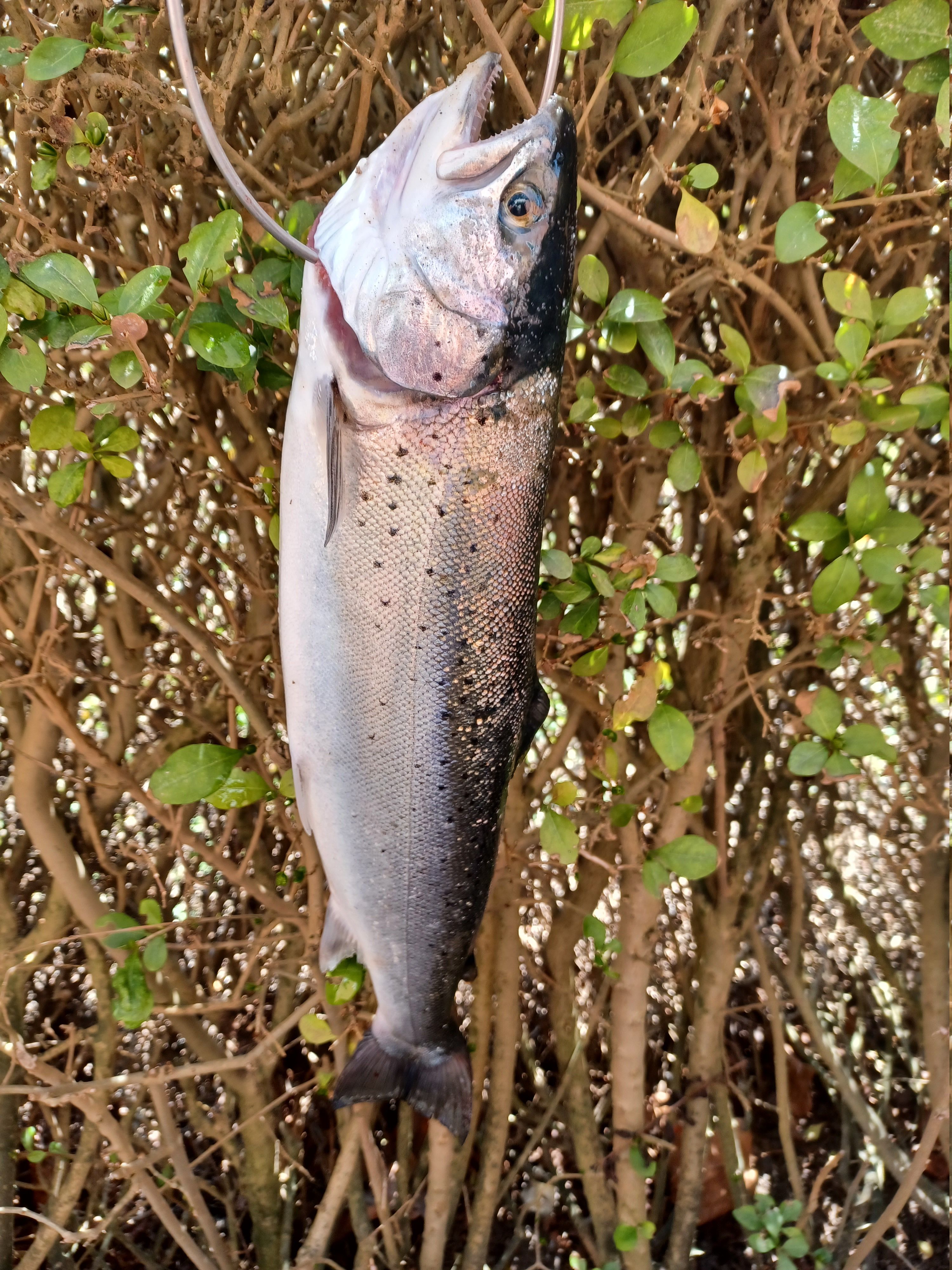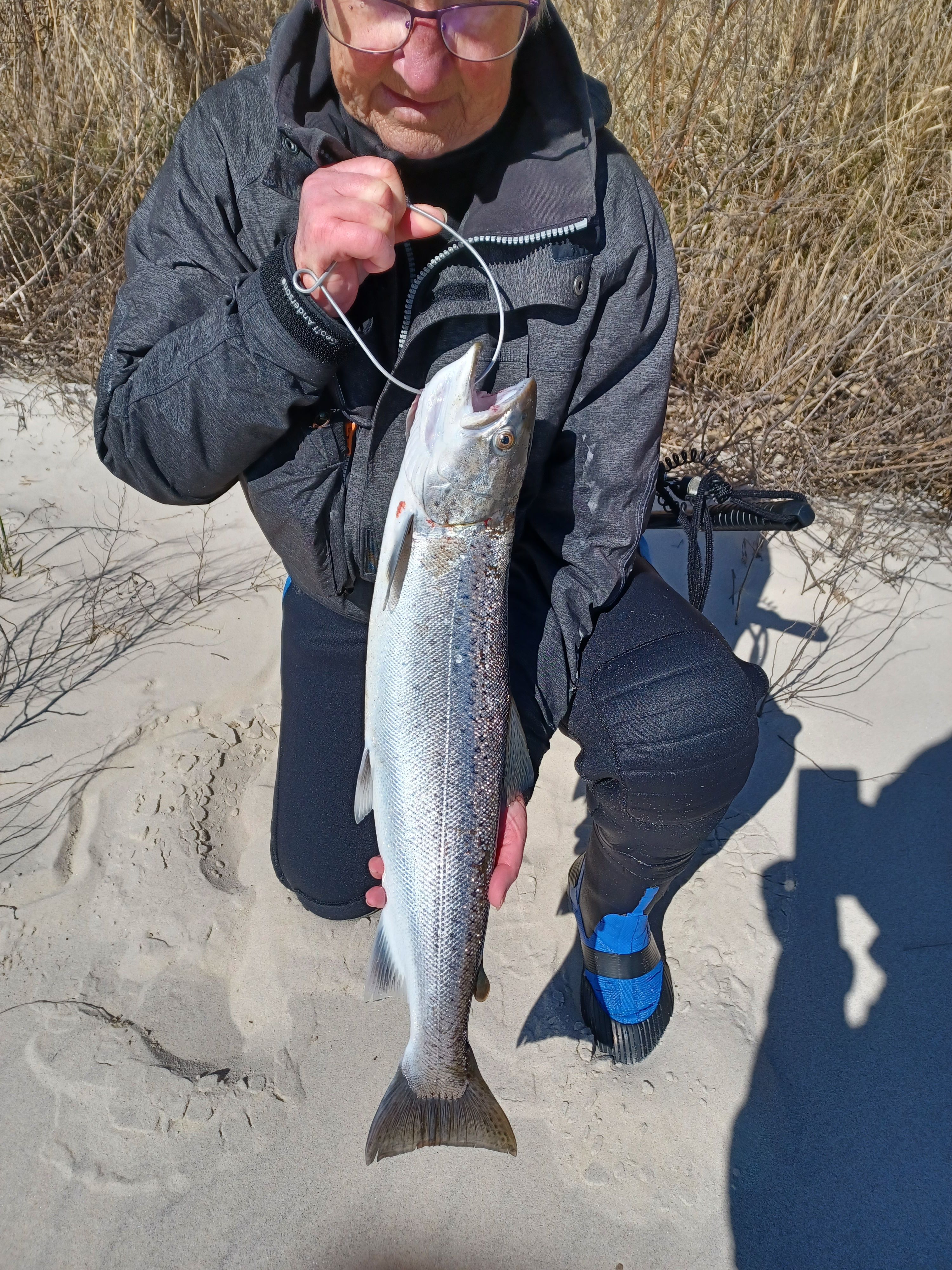 Gestern keinen Biss, heute gegen 12:00 Uhr die Meerforelle von 65 cm und 3 kg. Diesmal ein Bild vom Fisch vor dem Filetieren.