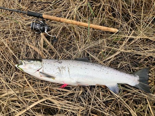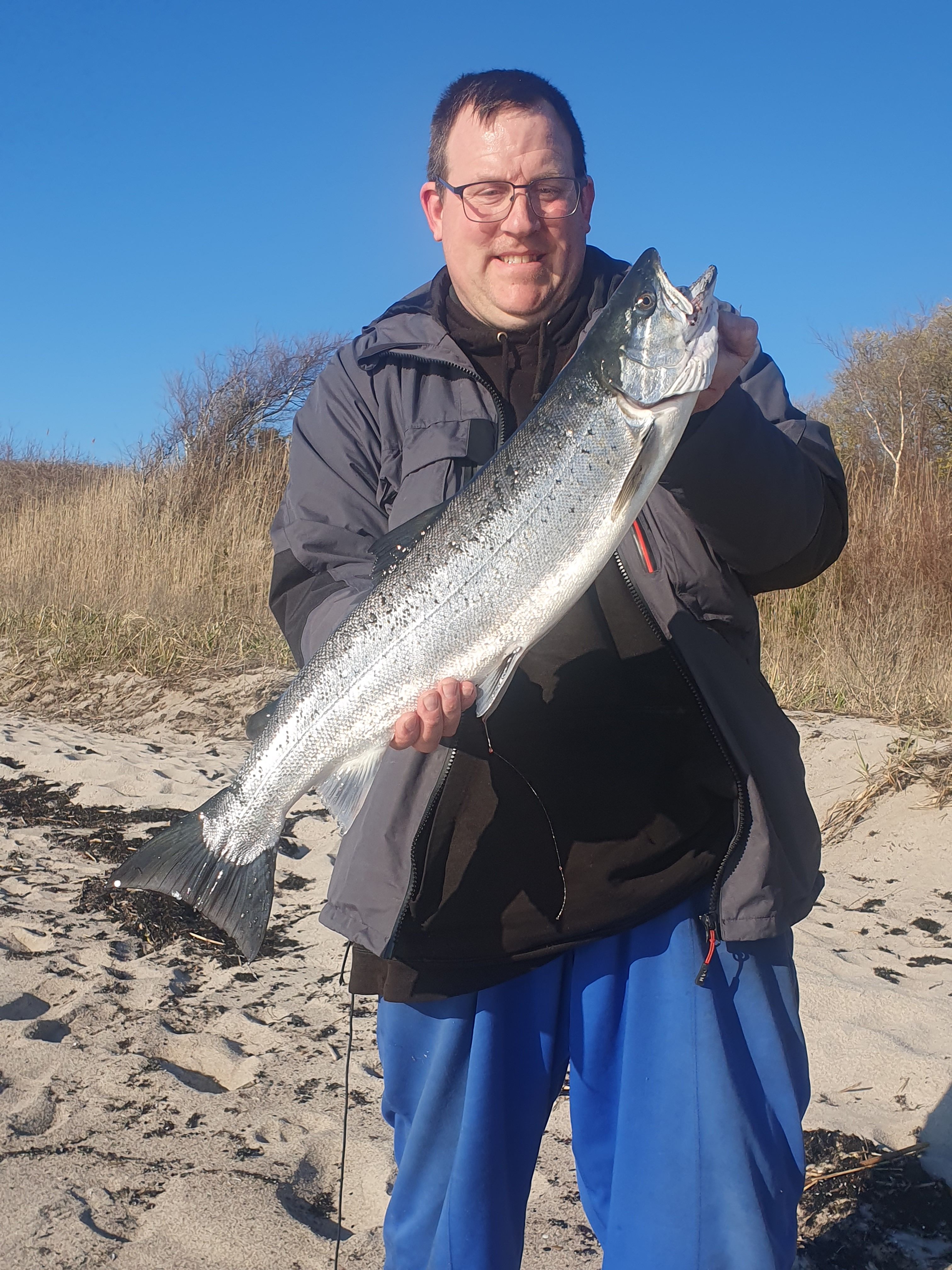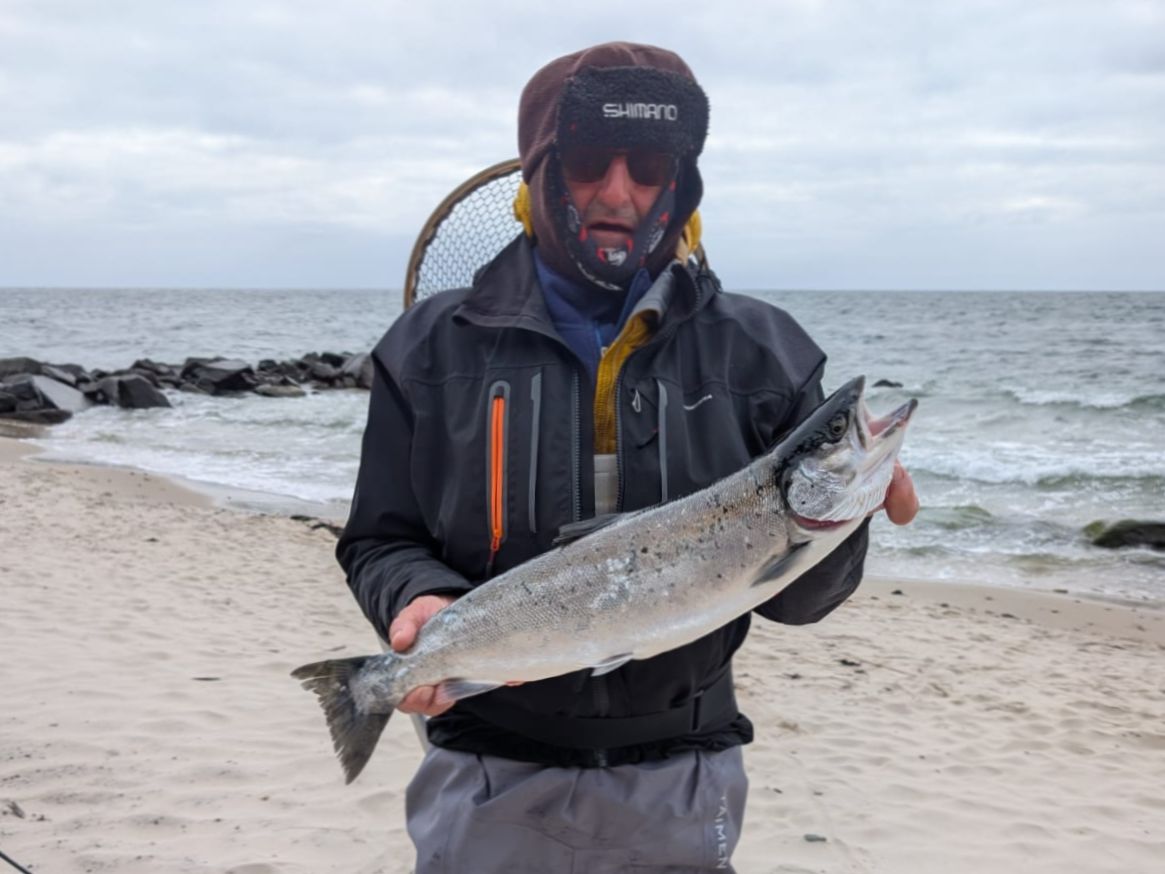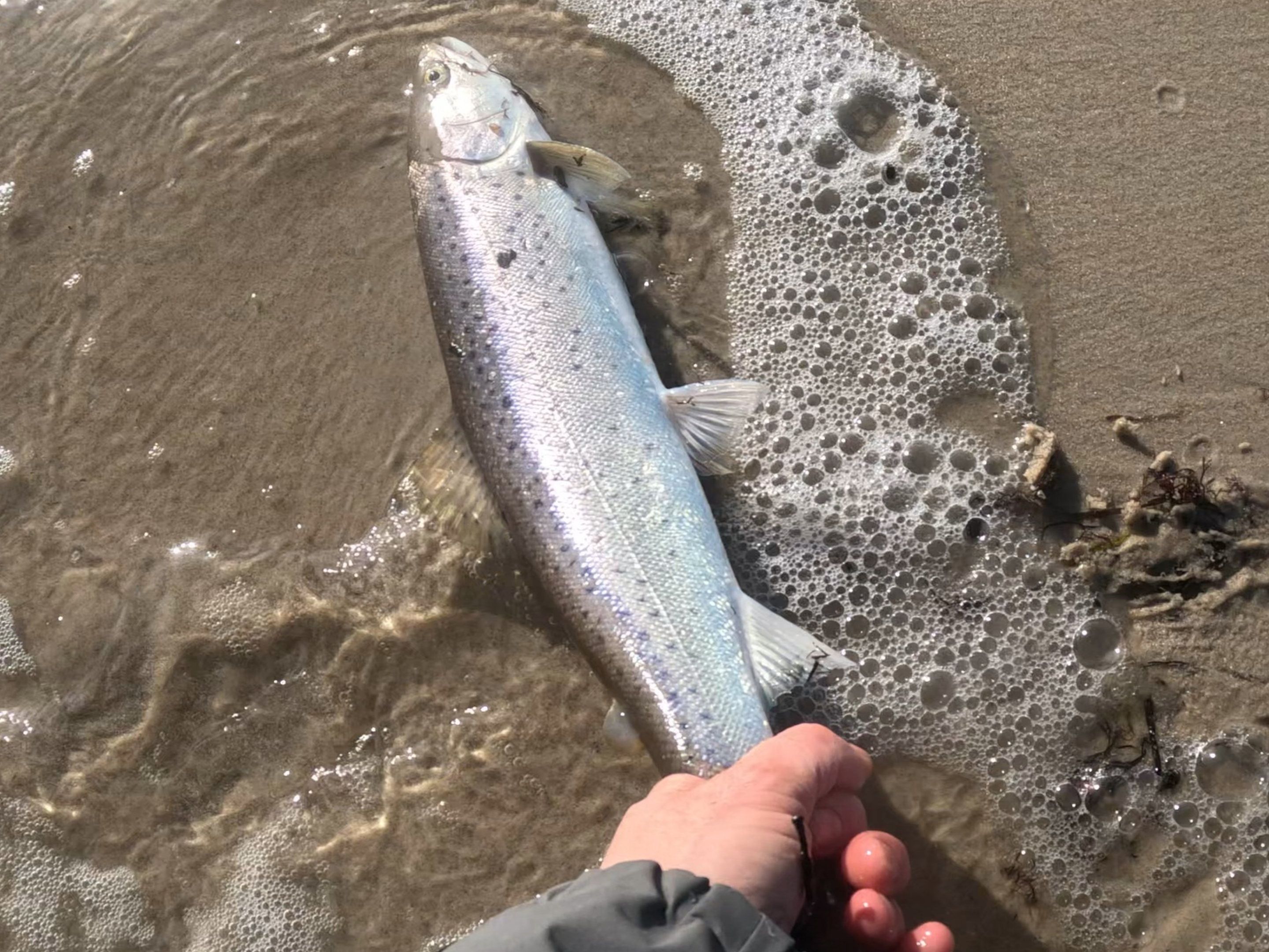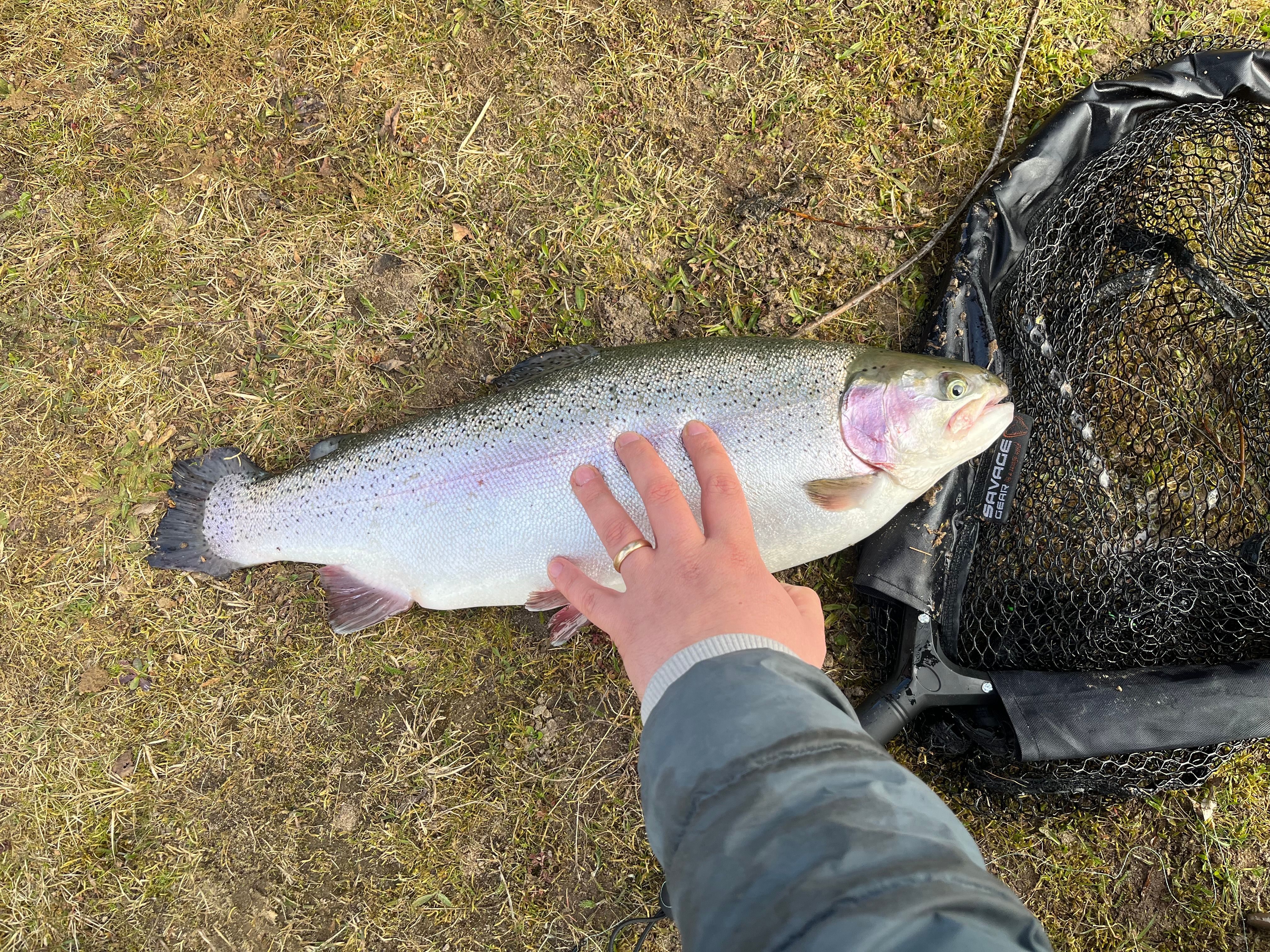 Kalter Wind von West ,nachdem Bodo schon 10 min. den Platz abgefischt hatte , konnte ich mit Bombarde mit Fliege ( PUSCHELROT ) beim 2 . Wurf erfolgreich sein .