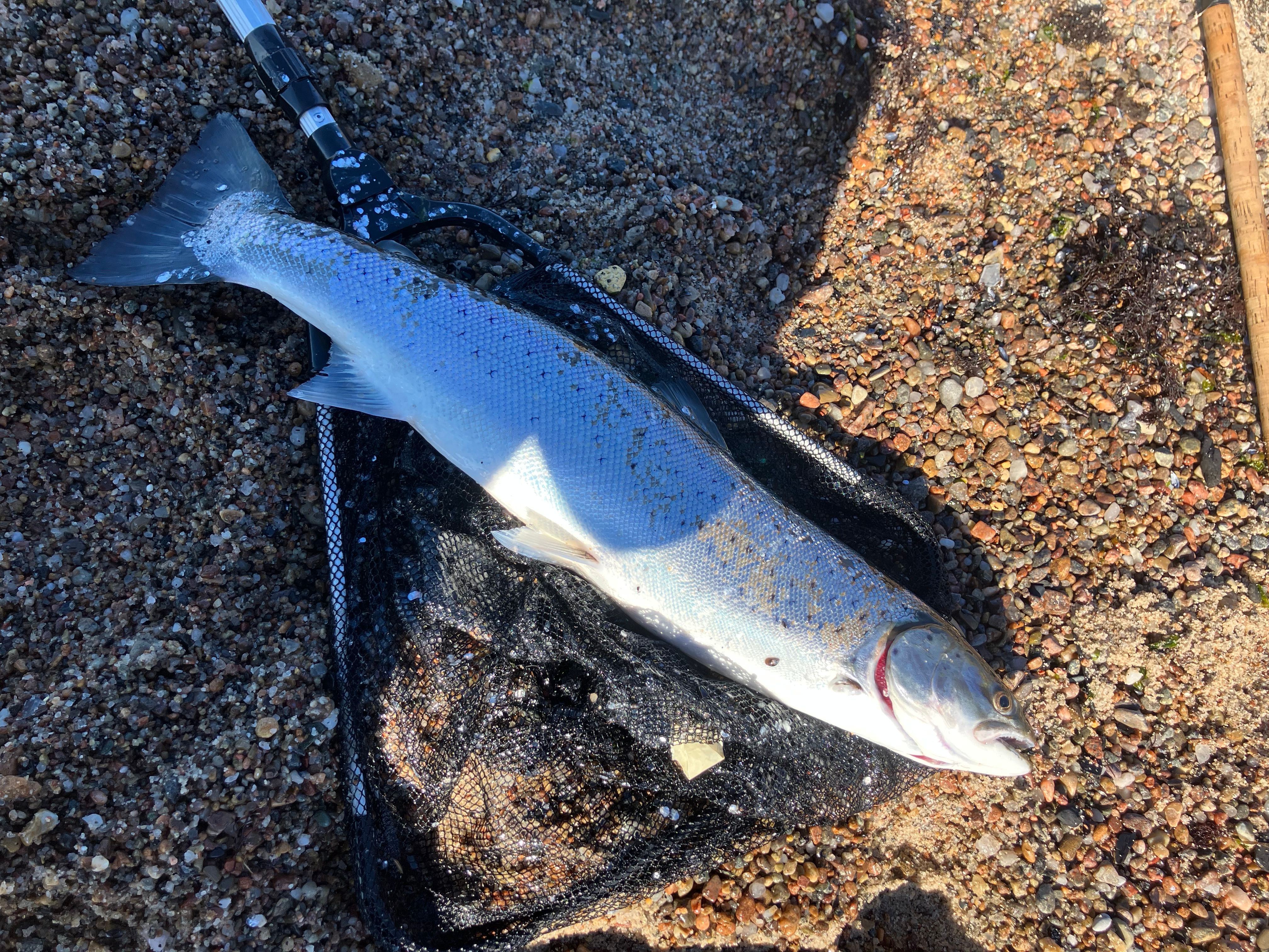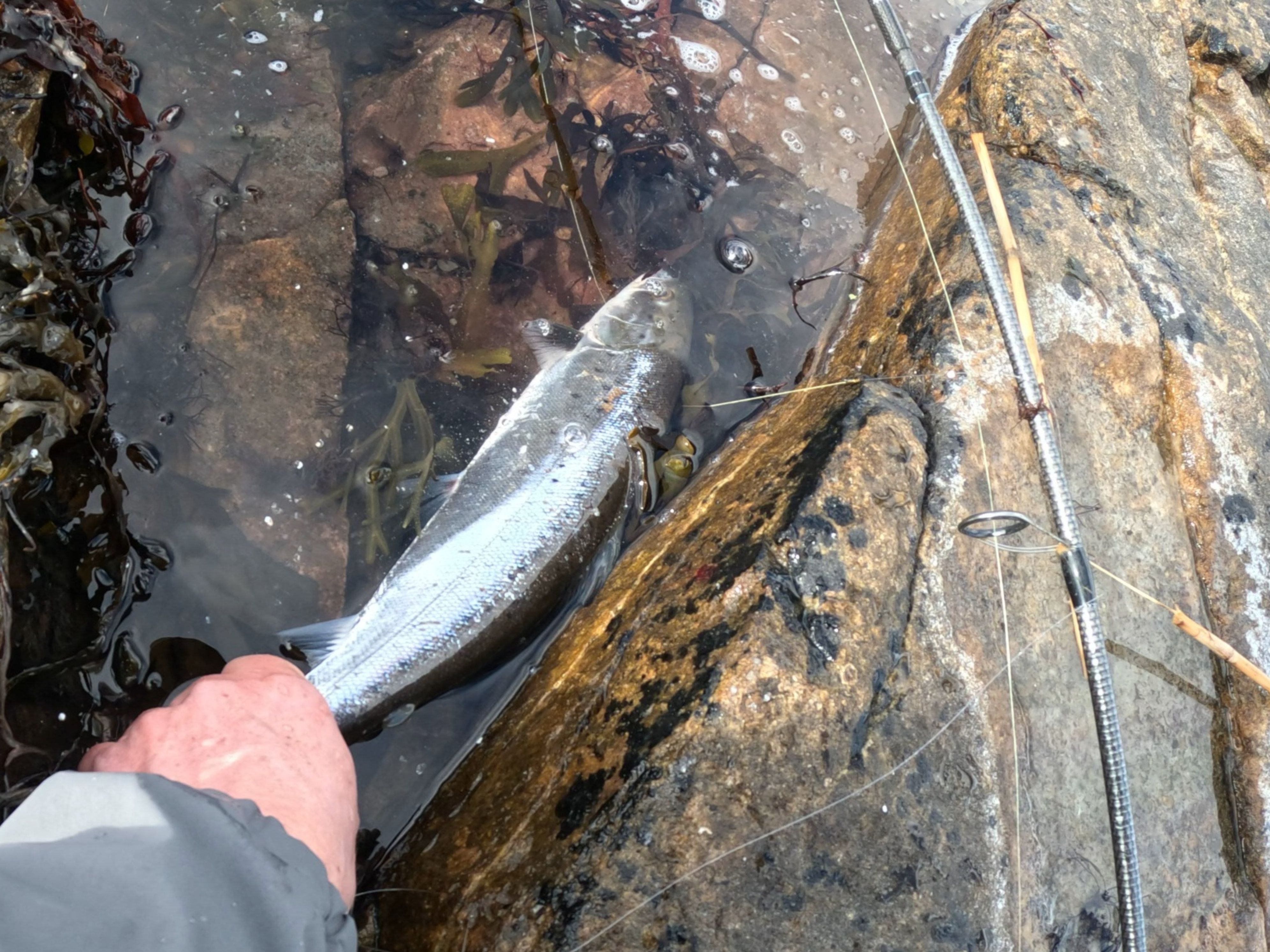 Endelig kom den ind på lavt vand og skulle nettes, men så valgte den lige at tage en tur mellem benene og så sad linen fast i mine vaders og jeg var bange for at den skulle smutte af krogen.