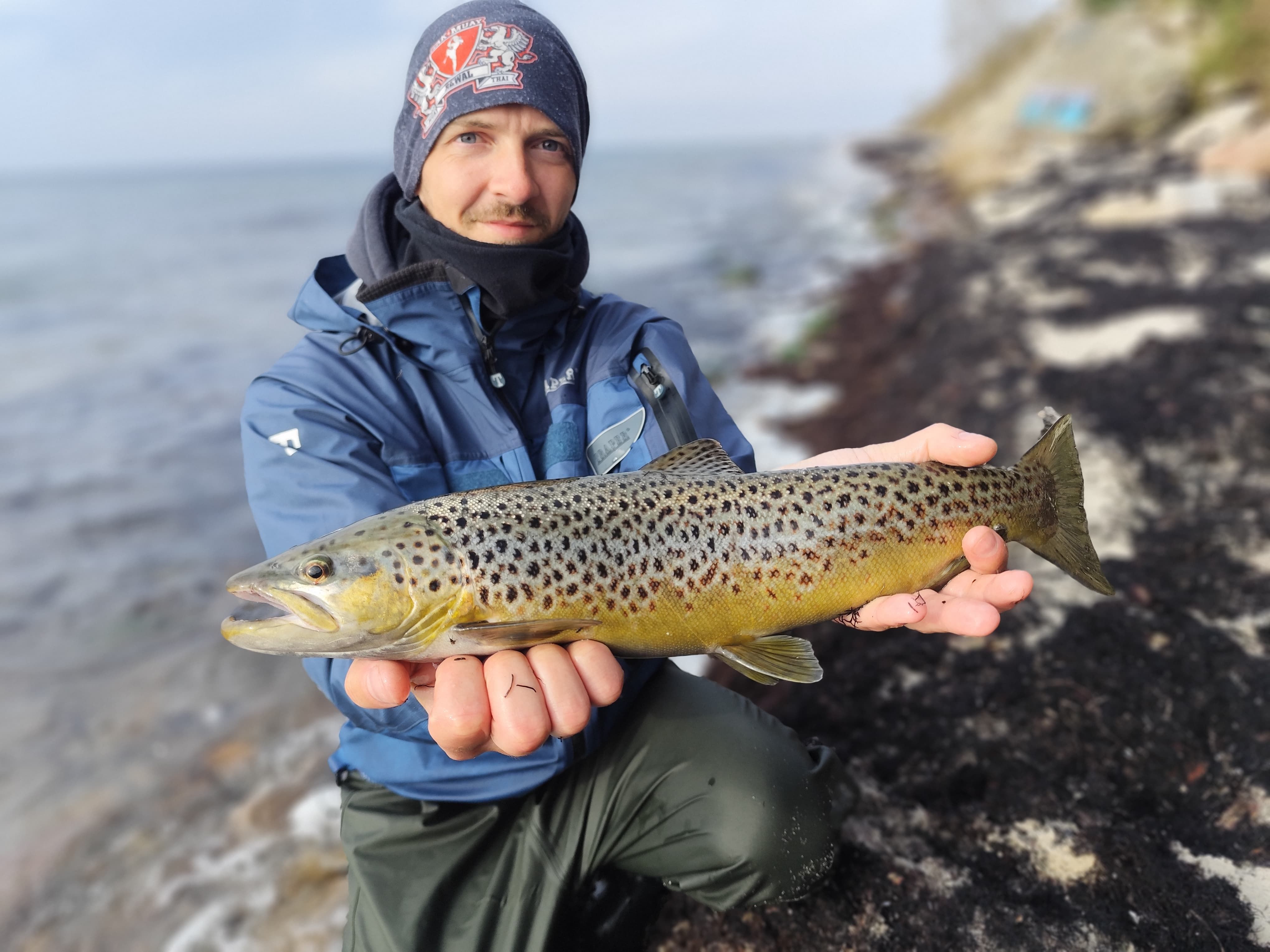 30 minutter fisket i vand til livet, et tungt hug ved spinstop, og op kom en smuk tyk fisk på 55 cm.