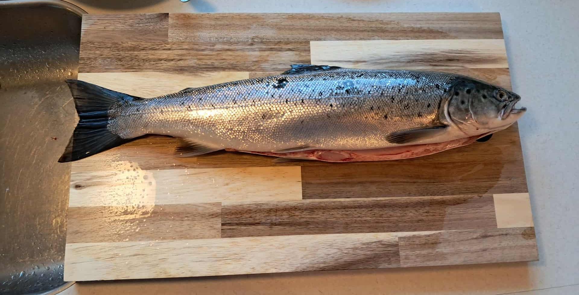 Efter en lang trækken rundt, hvor fisken gik dybt og gav voldsomme ryk fra sig, fik jeg den ind små 10 meter fra mig.