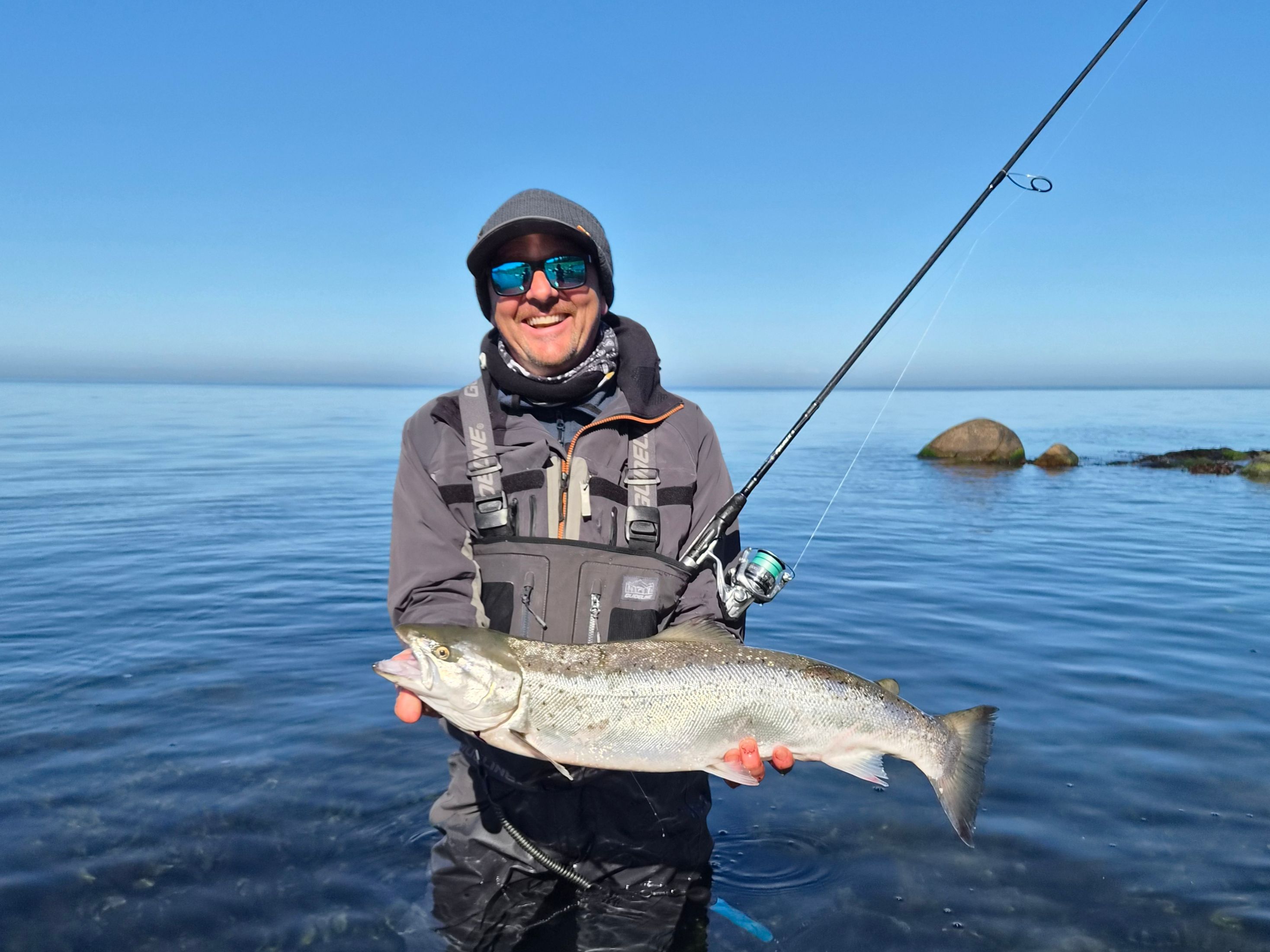 Efter ca 20 minutters fiskeri kastede jeg min 22 grams bornholmerpil ud bag om min makker. 3 m fra stangspidsen huggede fisken i det uklare vand.