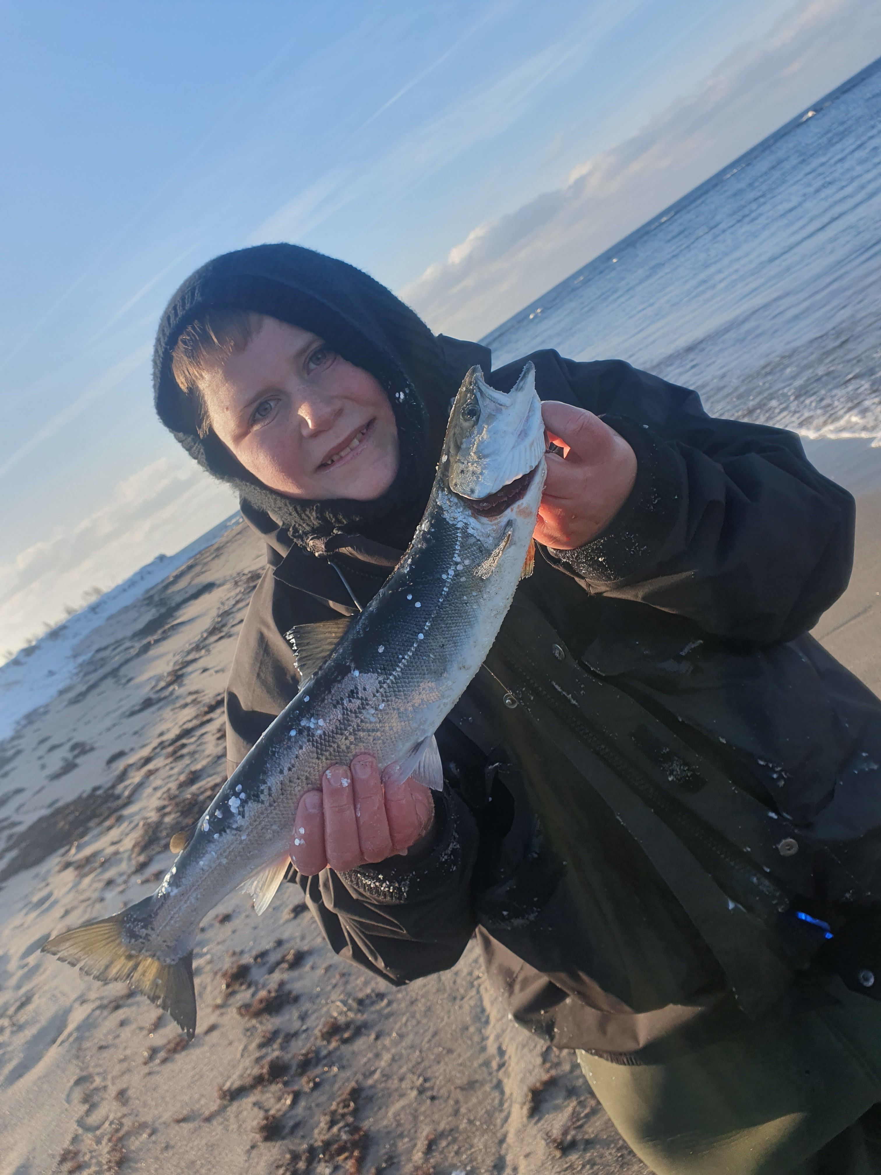 Kl. 10.30 var så et mere seriøst hug, og efter et par udløb lykkedes det at få den på land - en dejlig fornemmelse at få en god fisk - og så var det pludselig ikke så koldt mere.