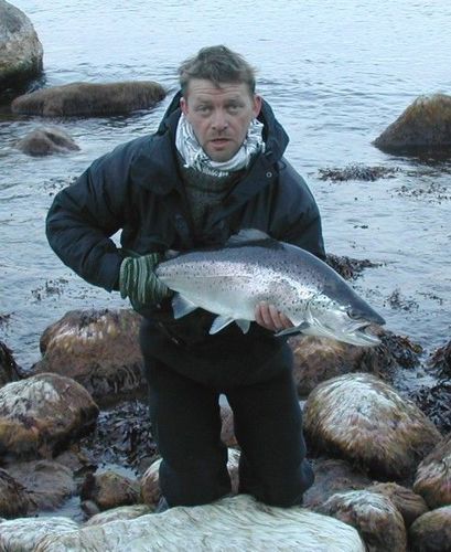 Efter ganske få kast, kommer hugget et pænt stykkke ude. Line bliver flået af hjulet, og så ryger den ellers af vandet måske 10 gange. Den rusker noget og svømmer på tværs et stykke ude - men holdes hårdt og til sidst kan jeg kane den ind og selv håndlande min hidtil absolut største og smukkeste havørred fra kysten.