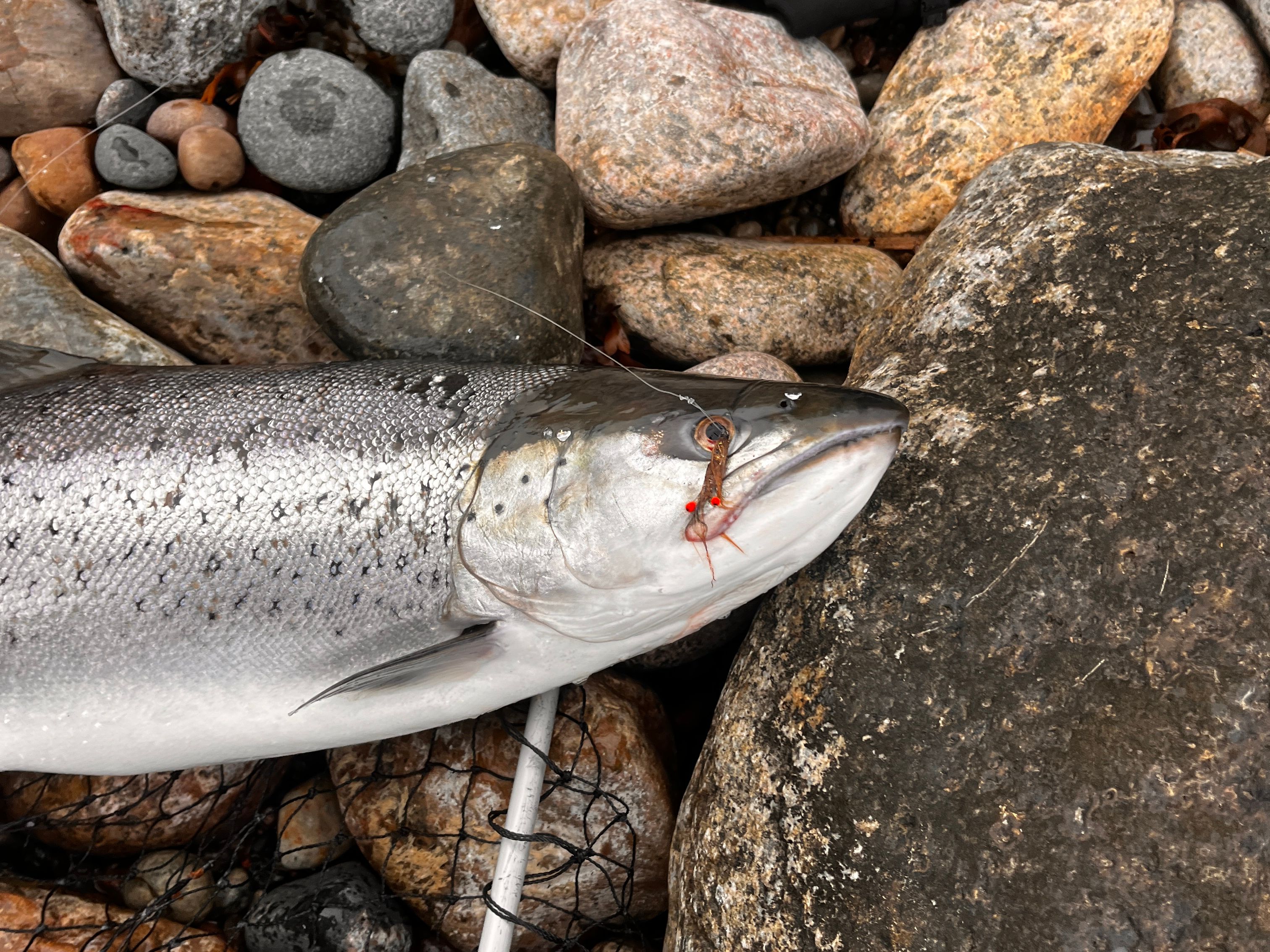 I mit 2. kast helt op af de store sten bider denne flotte overspringer på fluen💪🏽 jeg lander den flotte blanke sølvtorpedo i nettet, tak til "Bjørn Baron Von Silver".