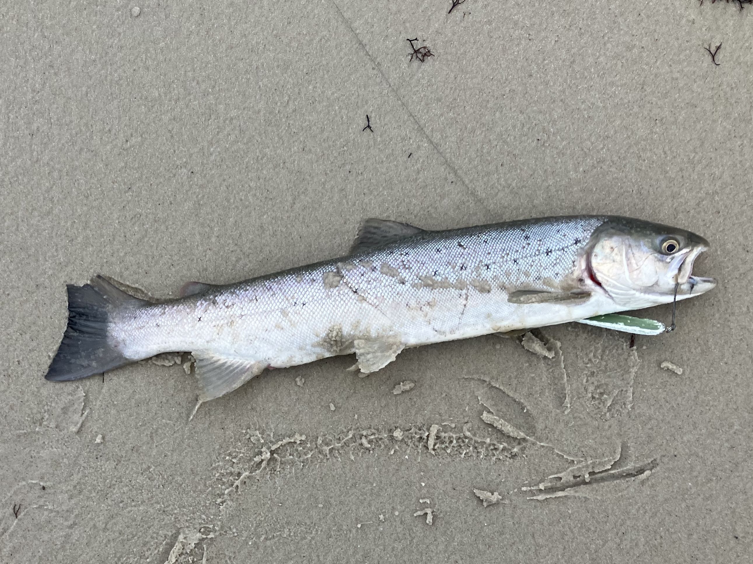 Pludselig svømmede den i fuld fart parallelt med land og lige forbi mig, så jeg absolut ingen kontakt havde før end den var de 10 -15 meter til venstre for mig. Heldigvis havde jeg fået løsnet sliren godt, for da der var kontakt igen fortsatte den i et udløb på mere 20 -30 meter udad. Så fik jeg da alligevel lige lidt kvalificeret modstand inden jeg kunne kane den med en dønning op på stranden.