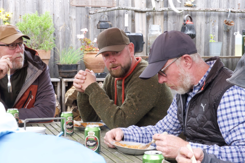 Kl. 12.00. Tilbage til Bjarkes have, hvor der igen er tændt op i bålgrillen til en god gang grillburger.