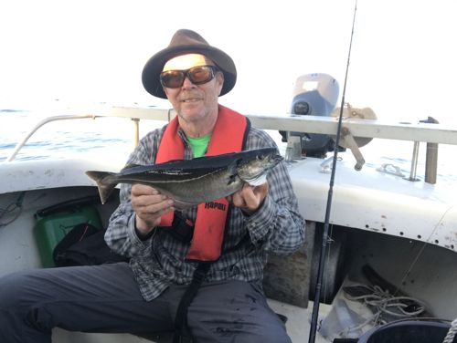 Er man heldig er der fine sej at fange. De er i rigtig god stand her i sommermånederne. Per Clausen fra Rønne med en flot tyksak af en sej på 1,1 kg og 45 cm 26. juni.