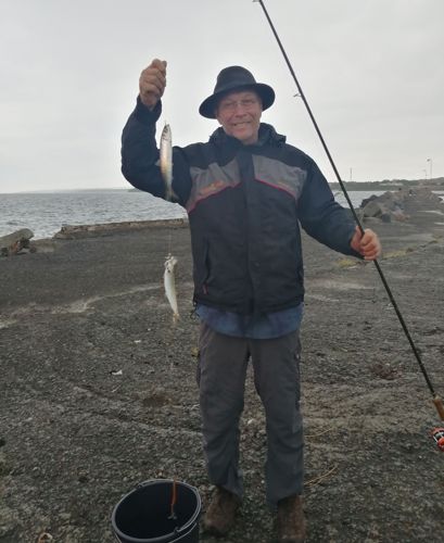 Går på molen og fanger sild, makreller, fladfisk og hvad der ellers fiskes der.