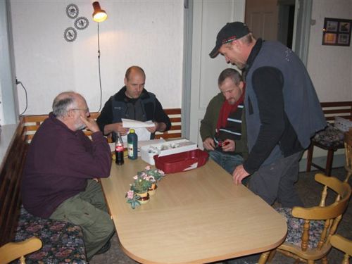 Sjældent møder man en så god fiskerstemning, som der er på denne første aften, hvor vi nu for tredje gang mødtes til en weekend med fiskeri, god mad og hygge. Denne brogede flok med fællesnæveneren kystfiskeri, faldt straks ind i den gængse bethesda-tone, hvor der hele aftenen lød latterbrøl, hvad enten det var fra hyggestuen, fra bordene hvor grejet blev ordnet eller fra køkkenskriverholdet.