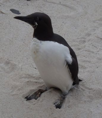 Jeg havde i formiddag en kedelig oplevelse ved Stenodden. Jeg skulle på strandtur med mine hunde, da vi kommer med på stranden sidder der en lomvig i sandet. Mine hunde gik forbi uden at ænse fuglen. Jeg blev nysgerrig, da den opførte sig mærkeligt, den strakte halsen flere gange. Jeg kunne gå helt tæt på lomvigen og fik øje på fiskesnøre i næbbet!