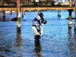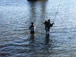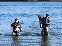 Så vi tog vaders, nettet på ryggen og så stangen i hånden, så var vi klar, ned til vandet og linen ud, smock sagde det og der var bid, Nicolai fik sin første havørred på, og dette skulle vise sig ikke at være den sidste. Timerne gik og der blev halet fisk i land, både dem der kunne blive indbragt men også fisk der skulle genudsættes. Samlet en god start dag med nogle flotte fisk.