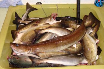 Det er primært fire fiskearter vi går efter: Torsk, lange, sej og hvilling. Skrubber går også på de agnede ophængerkroge, men de sættes ofte ud igen. Fra bådene har vi fanget alle arter. Lange har der været færrest af, men der er dog en del på fjorden lige nu, så der er masser af den fremragende kogefisk i fryseren. De største torsk er fileteret, mens de mindste (også dem på 25 til 35 cm, som heroppe er lovlige spisefisk) nu hænger til tørre. Når de er ”ræste” om et par uger koger vi dem og serverer dem med smeltet fåre-talg.