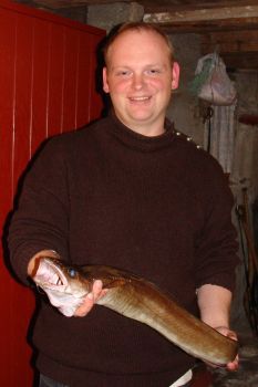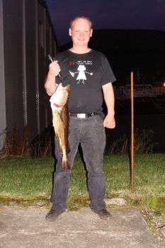 Et par ture med kystfiskeri er det også blevet til. I tirsdags vendt jeg hjem fra arbejde, blot for at opdage at alle var taget ud og fiske fra båd. UDEN MIG! Pr. telefon fortalte min yndige hustru mig at båden næsten var fyldt til bristepunktet, så de ville snart vende hjem. Min svoger var alene af sted i en anden båd, så der var kun en kysttur tilbage til mig. Jeg kørte ud til fjordmundingen, hvor der ligger et færgeleje. Her har jeg tidligere fanget skrubber, lange og småtorsk. Jeg riggede til med en kastepirk på 75 gram og kastede ud. Efter ti meters træk hen over bunden kom dagens hug. Hjulet hvinede da linien røg af, og en kort men meget hidsig kamp begyndte. En kysttorsk på lidt over 3 kg. havde taget pirken, og nu var gode råd dyre. Gaffen kunne ikke nå ned (Jesper – du må altså snart finde en længere telskopgaf til mig!), og stangen kunne helt sikkert ikke klare at jeg løftede vildbassen op med den. Jeg kiggede mig omkring, og fik øje på min svoger, Petur, der lå få hundrede meter væk i hans speedbåd. Jeg fik med besvær fisket telefonen op af bukselommen. Med én hånd på roret, og den anden om ketsjeren gled Petur 1 minut senere ind langs kajen, og nettede fisken i første forsøg.