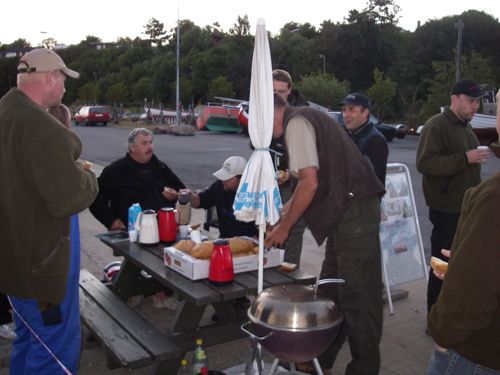 Men så bød Jesper også på morgenbrød på kajen til hele holdet. Så kom også skipper af sted i godt humør.