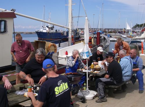 Disse blev indtaget med den gode appetit som 7 timer på havet giver, og selvfølgelig med deltagelse af de faste hang-a-rounds, de lokale havnebisser.